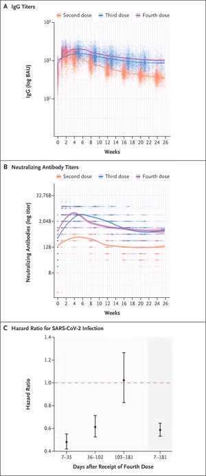 Die kumulative Inzidenzkurve ist in Abbildung S2 dargestellt, und die Wirksamkeit des Impfstoffs ist in dargestellt Abbildung 1C. Der Erhalt der vierten BNT162b2-Impfstoffdosis gewährte einen größeren Schutz gegen eine SARS-CoV-2-Infektion als der Erhalt von drei Impfstoffdosen (wobei der Erhalt der dritten Dosis mindestens 4 Monate zuvor erfolgte) (Gesamtwirksamkeit des Impfstoffs 41 %; 95 % Konfidenzintervall [KI], 35 bis 47). Die zeitspezifische Wirksamkeit des Impfstoffs (die in unserer Analyse die Infektionsraten bei Teilnehmern verglich, die sich seit der Impfung noch nicht infiziert hatten) nahm mit der Zeit ab und sank von 52 % (95 % KI, 45 auf 58) während der ersten 5 Wochen nach der Impfung bis –2 % (95 % KI, –27 bis 17) nach 15 bis 26 Wochen.“