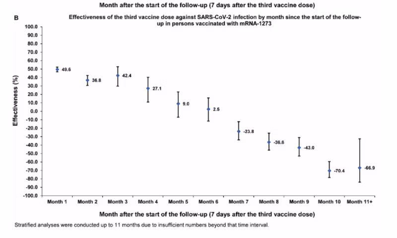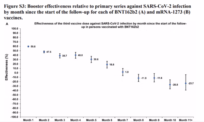 Die wichtigsten Ergebnisse, die das Scheitern des 4th Dosis, lautet wie folgt: „Vergleicht man das Ratenverhältnis über die Zeit seit der vierten Dosis (Figure 2) legt nahe, dass der Schutz gegen eine bestätigte Infektion mit der Omicron-Variante in der vierten Woche nach der Impfung ein Maximum erreicht, wonach das Ratenverhältnis bis zur achten Woche auf etwa 1.1 abfällt; diese Ergebnisse deuten darauf hin, dass der Schutz vor einer bestätigten Infektion schnell nachlässt … Die angepasste Infektionsrate in der achten Woche nach der vierten Dosis war sehr ähnlich zu der in den Kontrollgruppen; das Ratenverhältnis für die Drei-Dosen-Gruppe im Vergleich zur Vier-Dosen-Gruppe betrug 1.1 (95 % KI, 1.0 bis 1.2), und das Ratenverhältnis für die interne Kontrollgruppe im Vergleich zur Vier-Dosen-Gruppe betrug nur 1.0 ( 95 % KI, 0.9 bis 1.1).“ Diese Befunde zeigen keinen Unterschied.