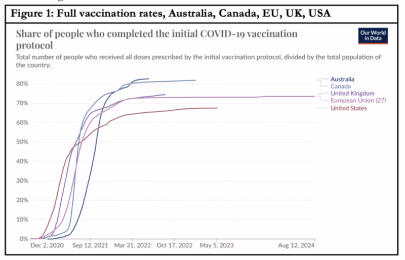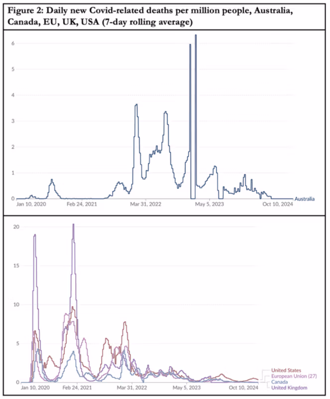Die Diskussionsteilnehmer offenbaren in ihren Verweisen auf Schweden eine erstaunliche, eindimensionale Ignoranz, als seien wir noch immer im Jahr 2020 steckengeblieben, anstatt uns schon fast dem Ende des Jahres 2024 zu nähern. Die einzigen Erwähnungen Schwedens erfolgen im Zusammenhang mit dem deutlich schlechteren ersten Jahr der Pandemie. „Australien hätte zwischen 15 und 46 Mal so viele Todesfälle gehabt, wenn es die gleichen Covid-bedingten Sterberaten verzeichnet hätte wie vergleichbare Länder wie Kanada und Schweden“, sowie Frankreich, Großbritannien und die USA.