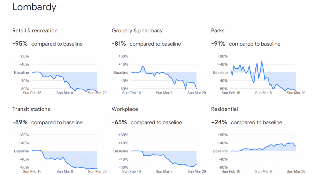 Google Mobilitätsdaten aus der Lombardei zeigen auch, dass es in der Zeit vor dem Lockdown keine Verhaltensänderung gegeben hat. Nach der Einführung der ersten Quarantänezone um einige Städte am 21. Februar kam es zwar zu einem Rückgang der Bewegung, es gab jedoch keine spätere Änderung, die erklären könnte, warum sich der Ausbruch in der Woche vor dem Lockdown verlangsamte.