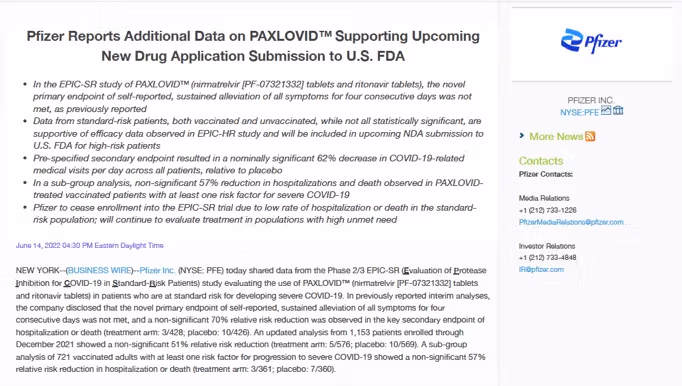 Gleichzeitig schürte Pfizer die Angst der Öffentlichkeit, indem es das Risiko einer Covid-19-Erkrankung überbewertete, was den Ärzten den Weg ebnete, Medikamente wie Paxlovid zur Behandlung der Krankheit zu verschreiben. Manchmal waren die Behauptungen irreführend.