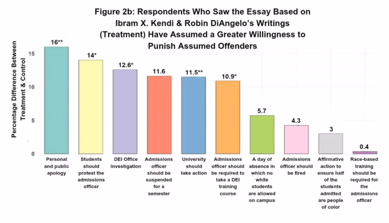 - Geförderte strafende Einstellungen: Teilnehmer, die diesen Materialien ausgesetzt waren, zeigten eine erhöhte Zustimmung zu Strafmaßnahmen gegen vermeintliche Unterdrücker. Sie waren eher bereit, Maßnahmen wie Suspendierung, öffentliche Entschuldigungen und obligatorische DEI-Schulungen zu befürworten, selbst wenn es keine Beweise für ein Fehlverhalten gab.
