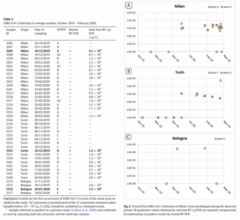 Dieses Datum – der 15. Dezember – kam mir bekannt vor, weil ich mich daran erinnerte, dass es mit dem frühesten PCR-Positiv aus Abwasserstudien in Italien zusammenfiel, das identifiziert SARS-CoV-2-RNA im Abwasser, erneut aus Mailand, am 18. Dezember 2019 (siehe Tabelle und Diagramme unten).