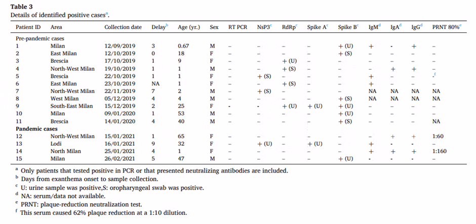Wie dem auch sei, was mir aufgefallen ist, ist, dass alle positiven Ergebnisse aus der Zeit vor der Pandemie in der Tabelle nur für ein Fragment der Virus-RNA positiv sind, bis auf eines. Diese eine Probe (Nummer neun) wurde am 25. Dezember 15 einer 2019-jährigen Frau im Südosten Mailands entnommen. Sie war in drei Fragmenten positiv und war damit der stärkste Beweis in der Studie für das Vorliegen einer echten Infektion.