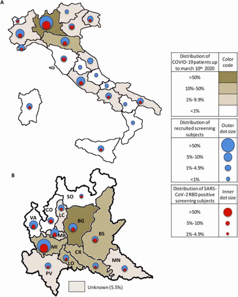 Die ersten Fälle vor der Pandemie traten hauptsächlich östlich von Mailand und Brescia auf (September-Oktober 2019), während spätere Fälle im Nordwesten Mailands identifiziert wurden (November-Dezember 2019). Aus Como, Monza-Brianza und Varese, Städten, die während der ersten Epidemiewelle nicht besonders von Covid-19 betroffen waren, wurden keine Fälle gemeldet