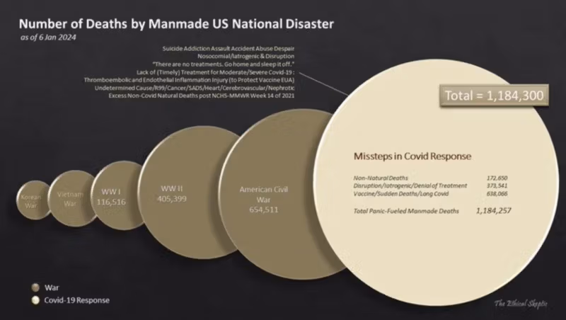 Das Quantengenie Ethical Skeptic verfolgt seit vier Jahren die übermäßigen Todesfälle infolge der verschiedenen Fehlschläge der Covid-Reaktion. Sein Forschungsprojekte zeigt, dass die Fehltritte bei der Covid-Reaktion (einschließlich Todesfälle aus Verzweiflung) nicht nur mehr Amerikaner töteten als Covid, sondern auch mehr Amerikaner töteten als alle ausländischen Kriege zusammen.