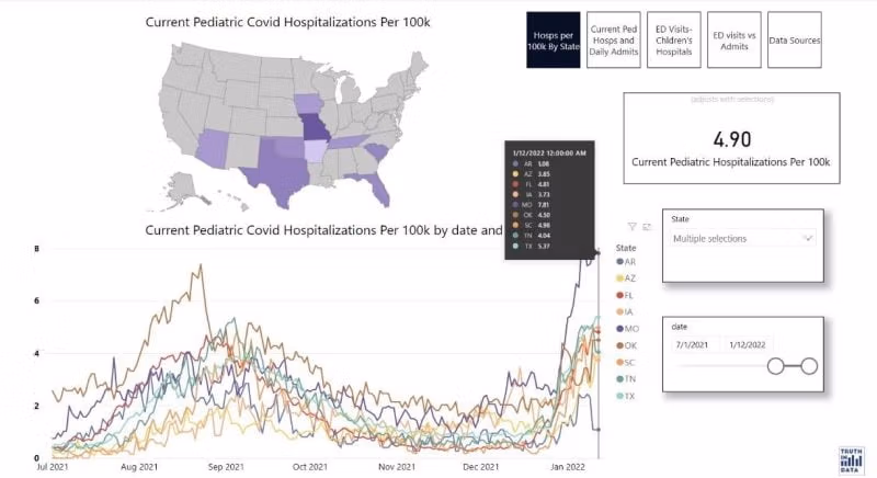 Wir haben uns an Josh Stevenson (@ifihadastick auf Twitter) gewandt, der während der Pandemie wiederholt erstaunliche Datenanalysen erstellt hat. Unten ist, was er aufgedeckt hat. Dies ist eine originelle Zusammenstellung, die Sie nirgendwo anders sehen werden. In den Bundesstaaten, in denen Masken vorgeschrieben sind, liegen die pädiatrischen COVID-19-Krankenhausaufenthalte im Durchschnitt bei 4.23 pro 100,000 Kinder: