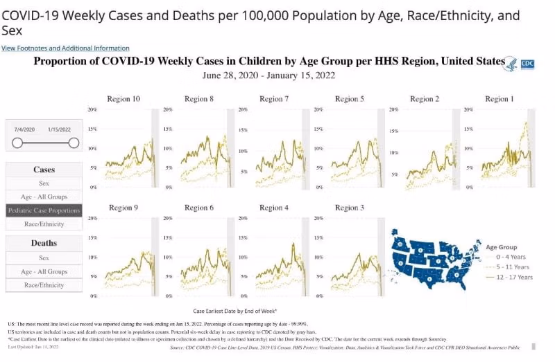 Der Anteil pädiatrischer positiver Tests ist derzeit in allen Teilen des Landes ähnlich, etwa 20% aller positiven Tests in den drei unten gezeigten Altersgruppen von 0 bis 17 Jahren. Dies ist unabhängig von Wetter (Saisonalität) oder Einschränkungen ungefähr gleich: