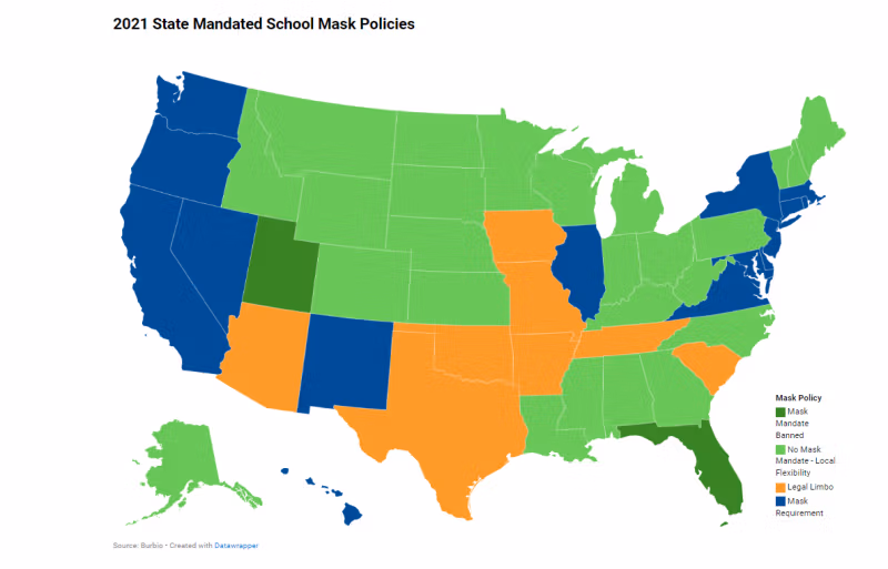 Nahezu 30 % aller Schulen sind rechtlich daran gehindert, Mandate umzusetzen, oder stehen vor anhängigen rechtlichen Anfechtungen von Beschränkungen, was bedeutet, dass nur wenige in diesen Staaten Beschränkungen auferlegen, wie wir es in den Jahren 2020-2021 gesehen haben. Nachfolgend sind die Staaten mit und ohne Gesichtsmaskenpflicht in Schulen aufgeführt.