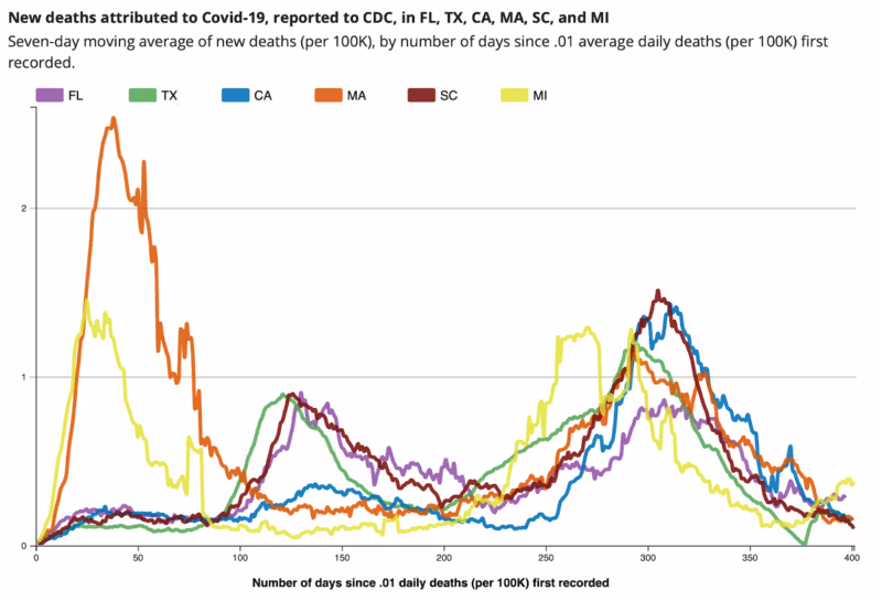 Betrachten Sie zum Beispiel diese CDC-Tabelle mit 3 Staaten, die strenge Maßnahmen verhängt haben (Michigan, Kalifornien und Massachusetts) und immer noch viele Maßnahmen plus Maskenmandate durchsetzen, im Vergleich zu 3 Staaten, die ohne solche Mandate geöffnet waren (Florida, Texas und South Carolina). ). Schauen Sie sich den Verlauf schwerwiegender Folgen des Virus an: