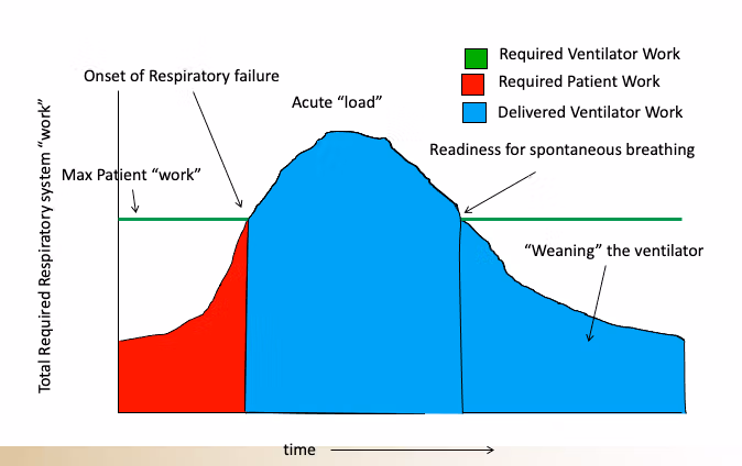 Ich erklärte, dass die Indikation für die Einrichtung einer mechanischen Beatmung niemals auf einem Sauerstoffgehalt basieren sollte, sondern es sein muss basiert fast ausschließlich auf einer Beurteilung der „Atemarbeit“ des Patienten und seiner Fähigkeit, diese Atemarbeit aufrechtzuerhalten. Hier wird es etwas komplizierter, da die Fähigkeit eines Patienten, eine erhöhte Atemarbeit aufrechtzuerhalten, selbst von mehreren Faktoren abhängt, wie seiner Gebrechlichkeit (oder umgekehrt seiner Kraft), seinem mentalen Zustand und der Ursache seines Atemversagens (einige Bedingungen werden leichter und schneller umgekehrt als andere). Hier ist ein Schema, mit dem ich versuchen würde, dieses Konzept meinen Schülern beizubringen (hergestellt von meinem alten Kollegen Nate Sandbo an der UW).